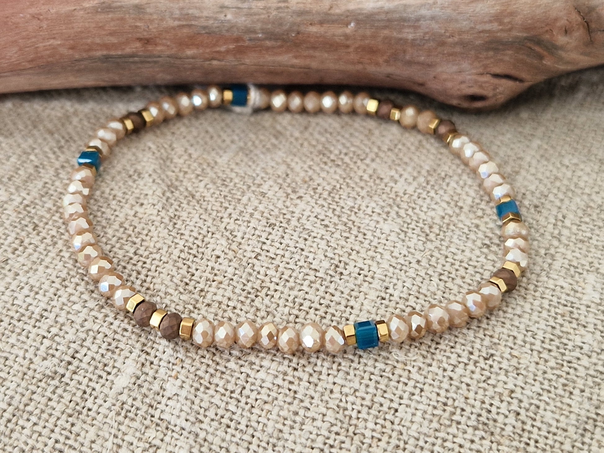Bracelet en perles de verre (dans les tons mordoré, bleu et moka) et perles dorées