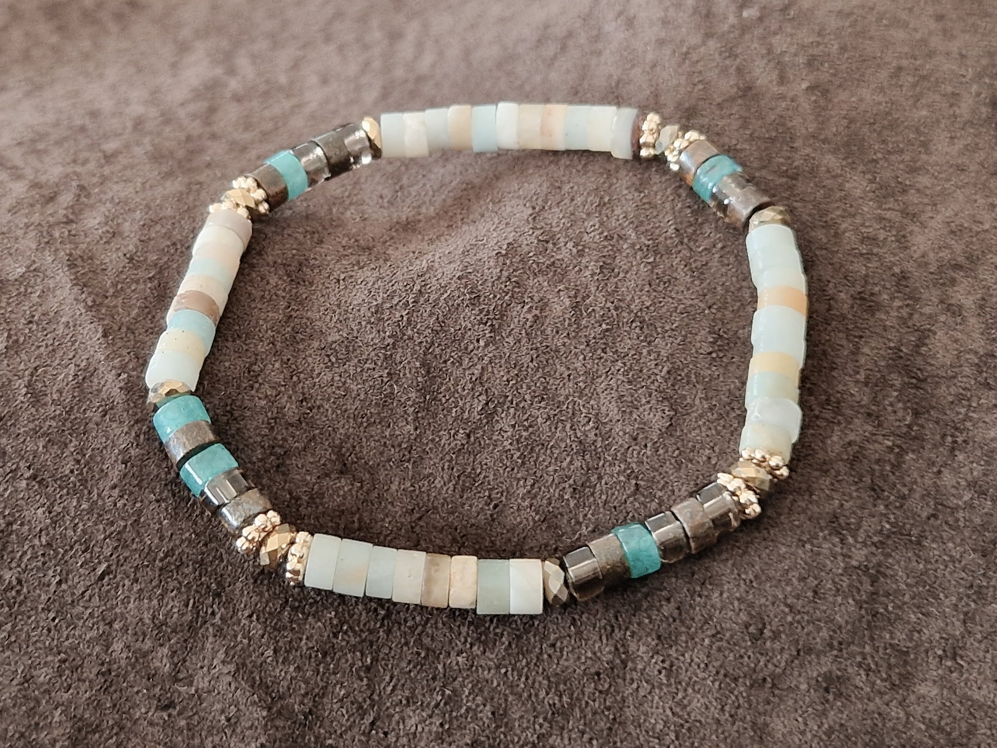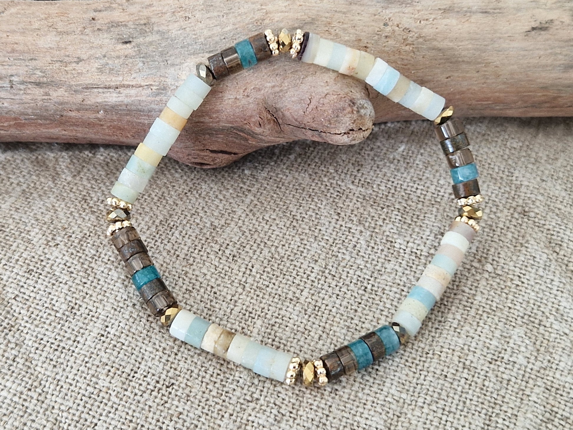 Bracelet heishi en amazonite, quartz fumé et perles dorées