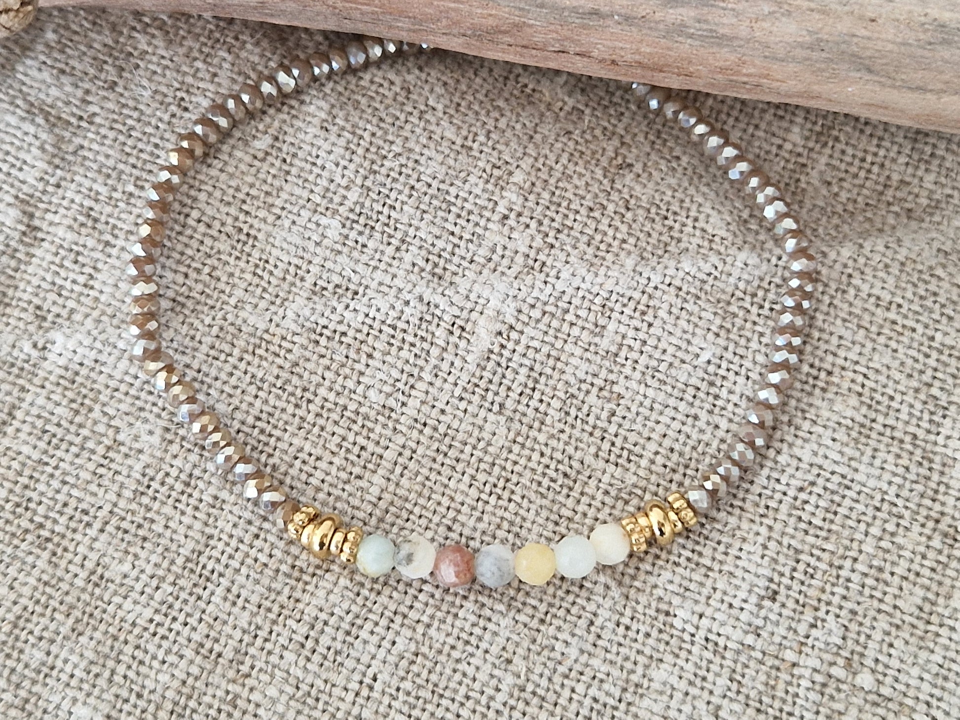 Bracelet en mini perles de verre marron glacé, perles à facettes en amazonite et perles dorées