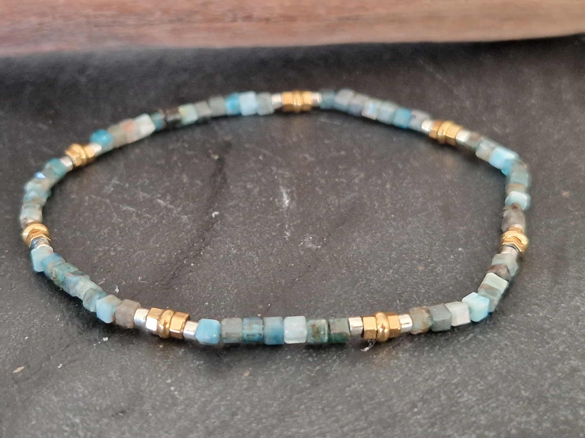 Bracelet en petites perles carrées d'apatite agrémenté de perles dorées et argentées