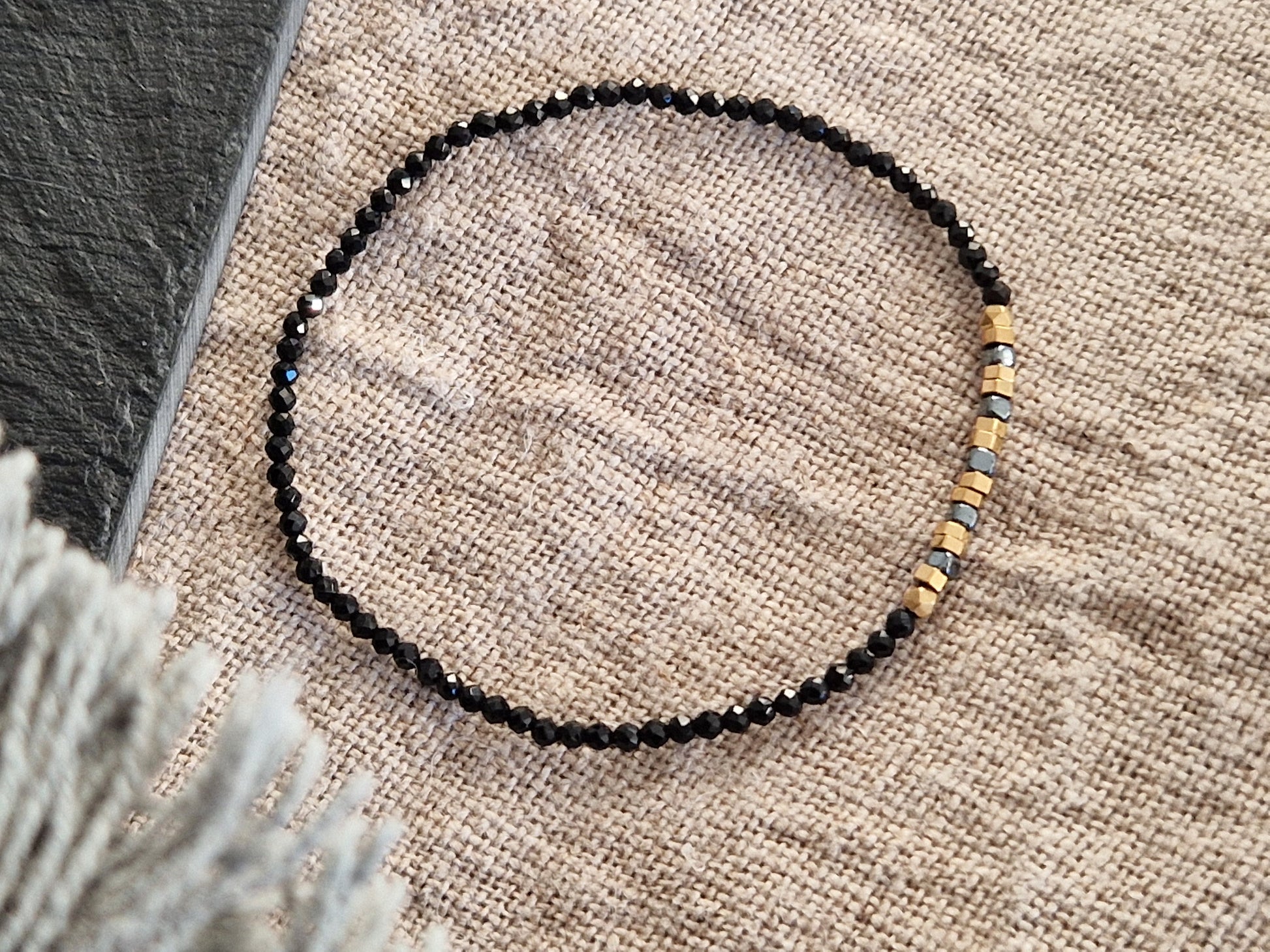 Bracelet en spinelle noir à facettes et petites perles en hématite. Il s'accorde avec de nombreux autres bracelets pour un look encore plus rock