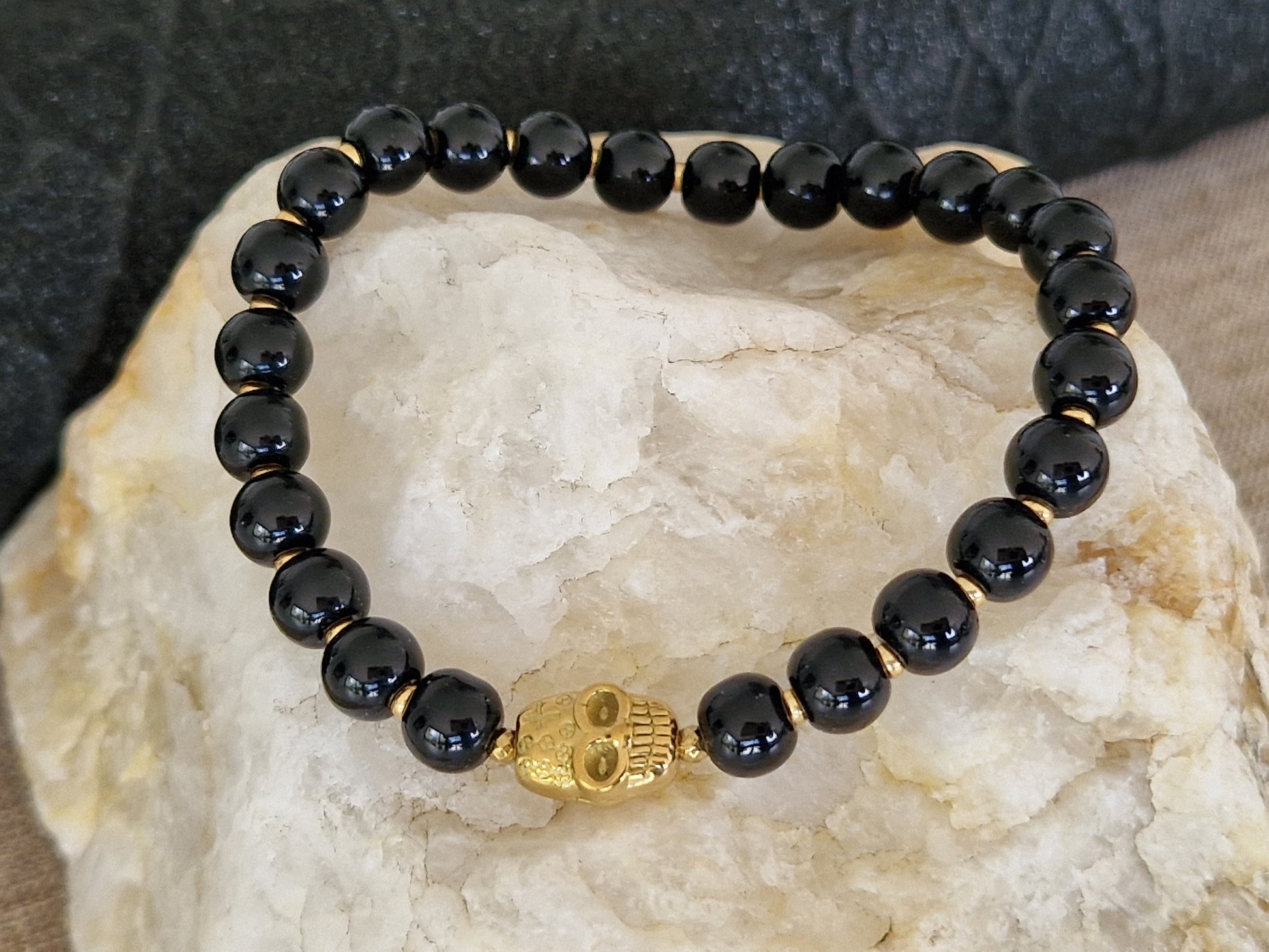 Bracelet en perles rondes d'onyx noir et tête de mort en acier doré