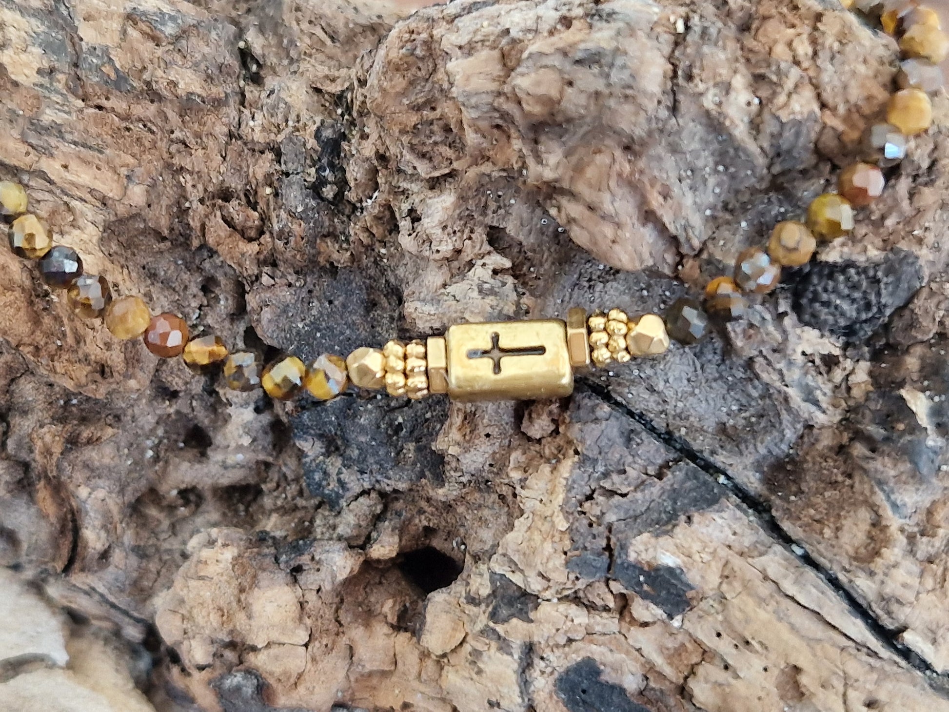 Un bracelet fin et minimaliste au charme naturel. L'œil de tigre capte la lumière avec élégance, tandis qu'une perle dorée matte ornée d'une croix apporte une touche graphique subtile et contemporaine.