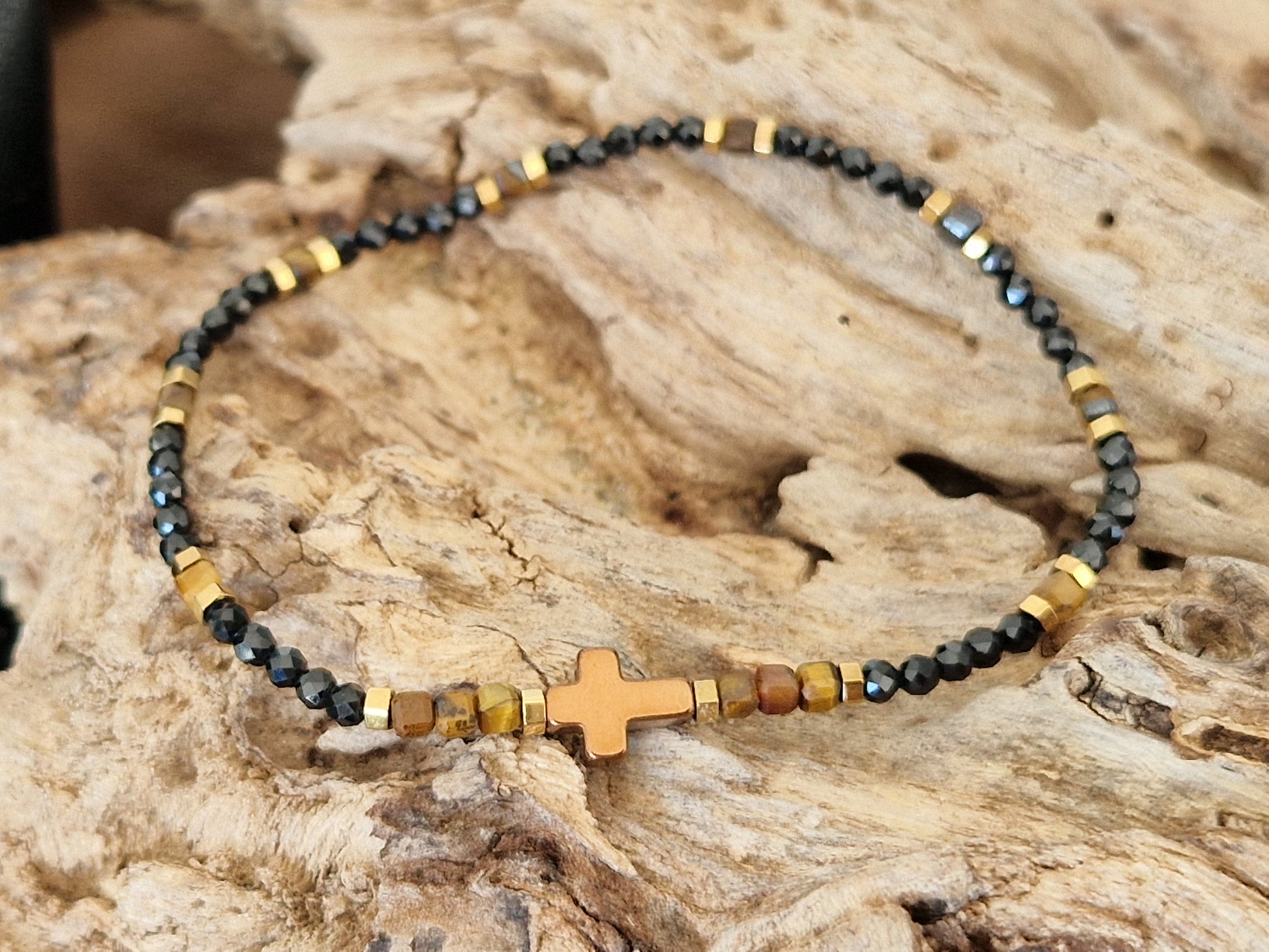 Un bracelet fin et élégant, aux couleurs profondes et chatoyantes. Le spinelle noir à facettes scintille sous la lumière et met en valeur les perles carrées d'œil de tigre, créant un effet chromatique chaleureux. Une perle cuivrée en forme de croix vient ajouter une touche graphique contemporaine.