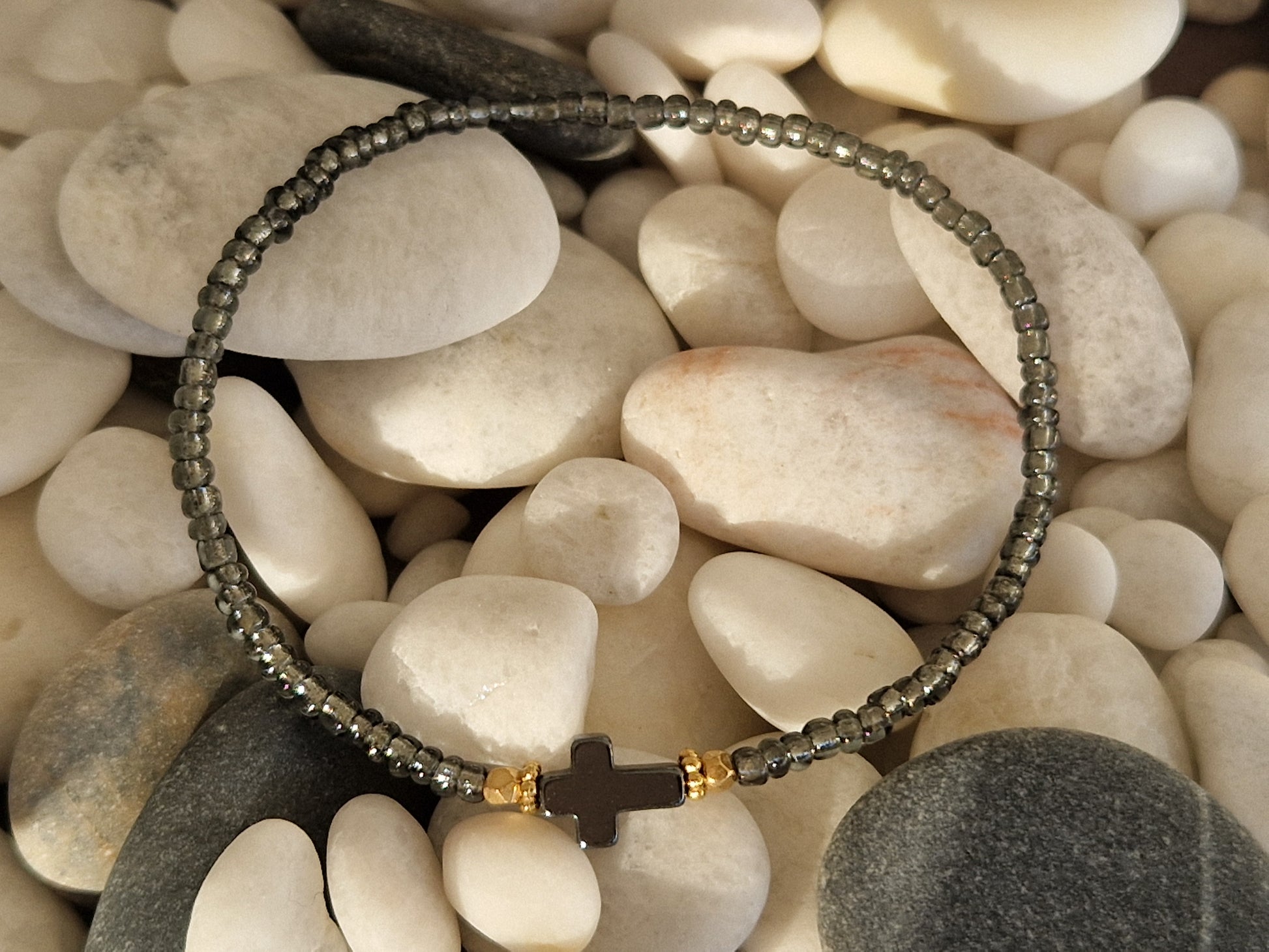 Graphique et élégant, ce bracelet joue la carte du minimalisme avec ses perles de rocaille grises et sa croix en hématite métallisée.