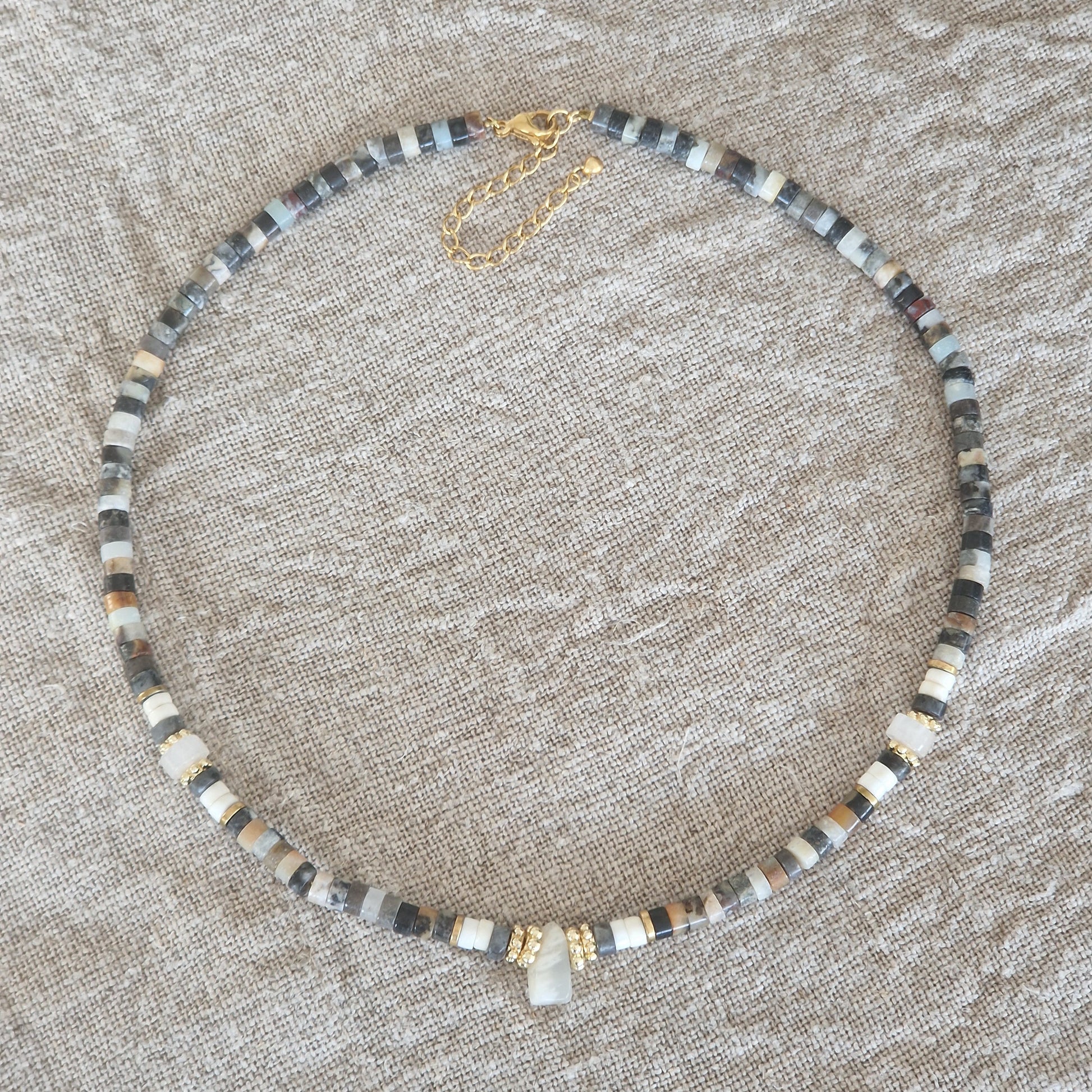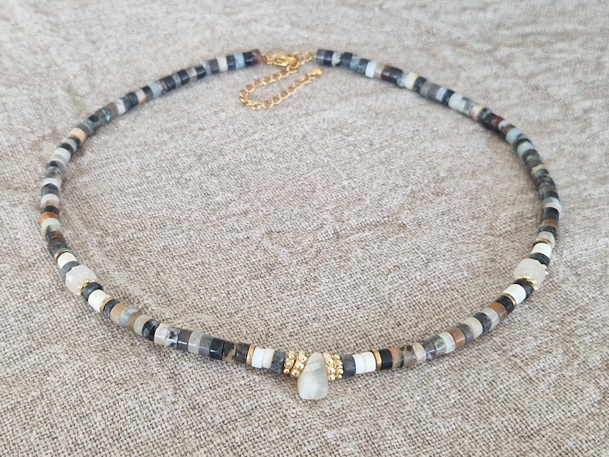 Un collier court aux nuances naturelles et minérales, qui marie la richesse marbrée de l'agate crazy lace, la douceur matte de la magnésite blanche, et l'éclat lunaire d'une perle centrale en pierre de lune. Un bijou équilibré et texturé, à l'élégance sobre et organique.