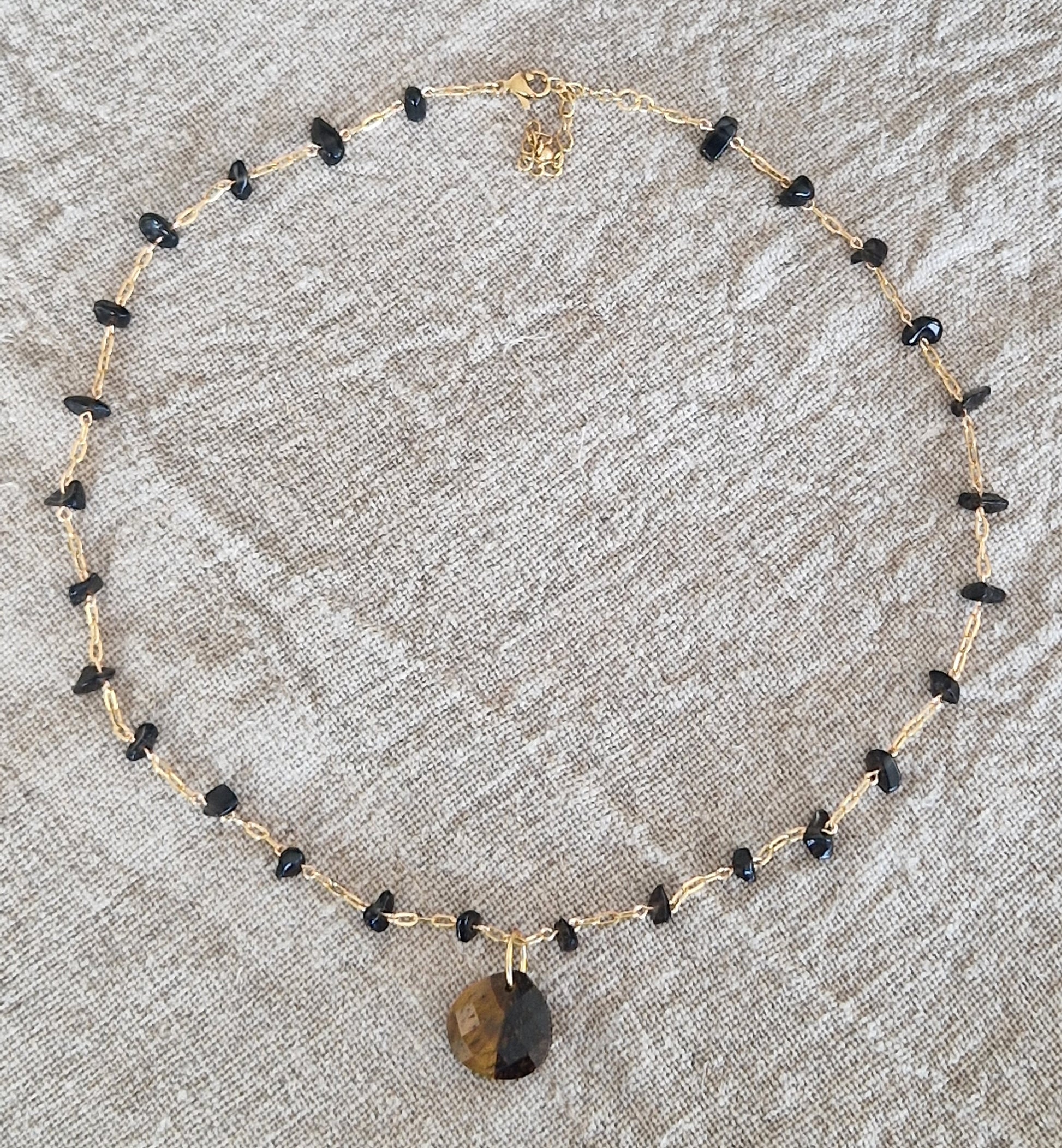 Un bijou audacieux et élégant, mêlant la brillance de l'acier doré, la texture brute des chips d'agate noire et l'éclat chaud d'une goutte facettée en œil de tigre. Ce contraste de matières et de couleurs crée un collier à la fois chic et sauvage.