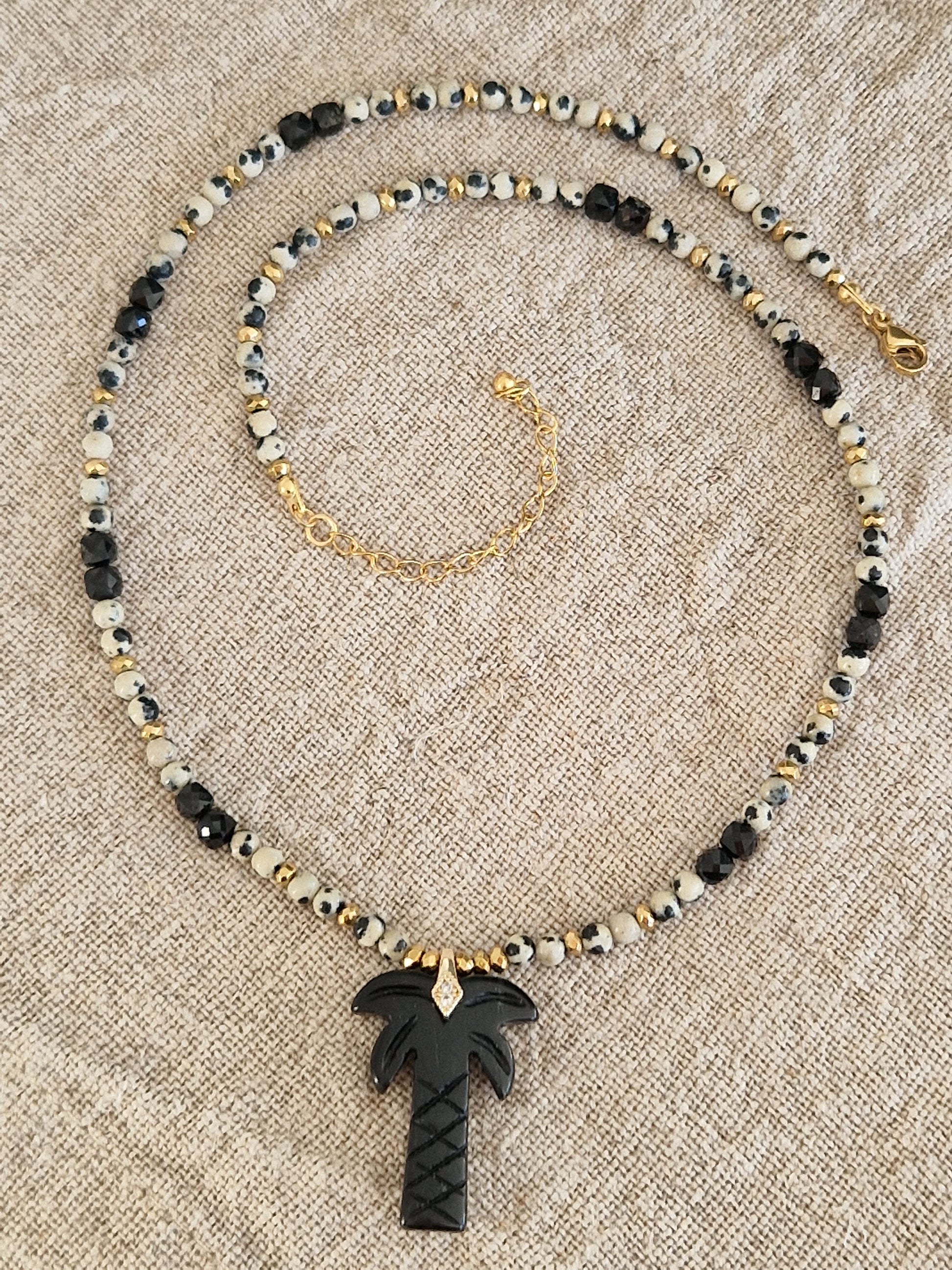 Un collier original et stylé, qui mixe les motifs naturels du jaspe dalmatien, les carrés facettés d'agate noire pour une touche graphique, et un pendentif palmier noir qui signe une allure urbaine et un brin exotique.