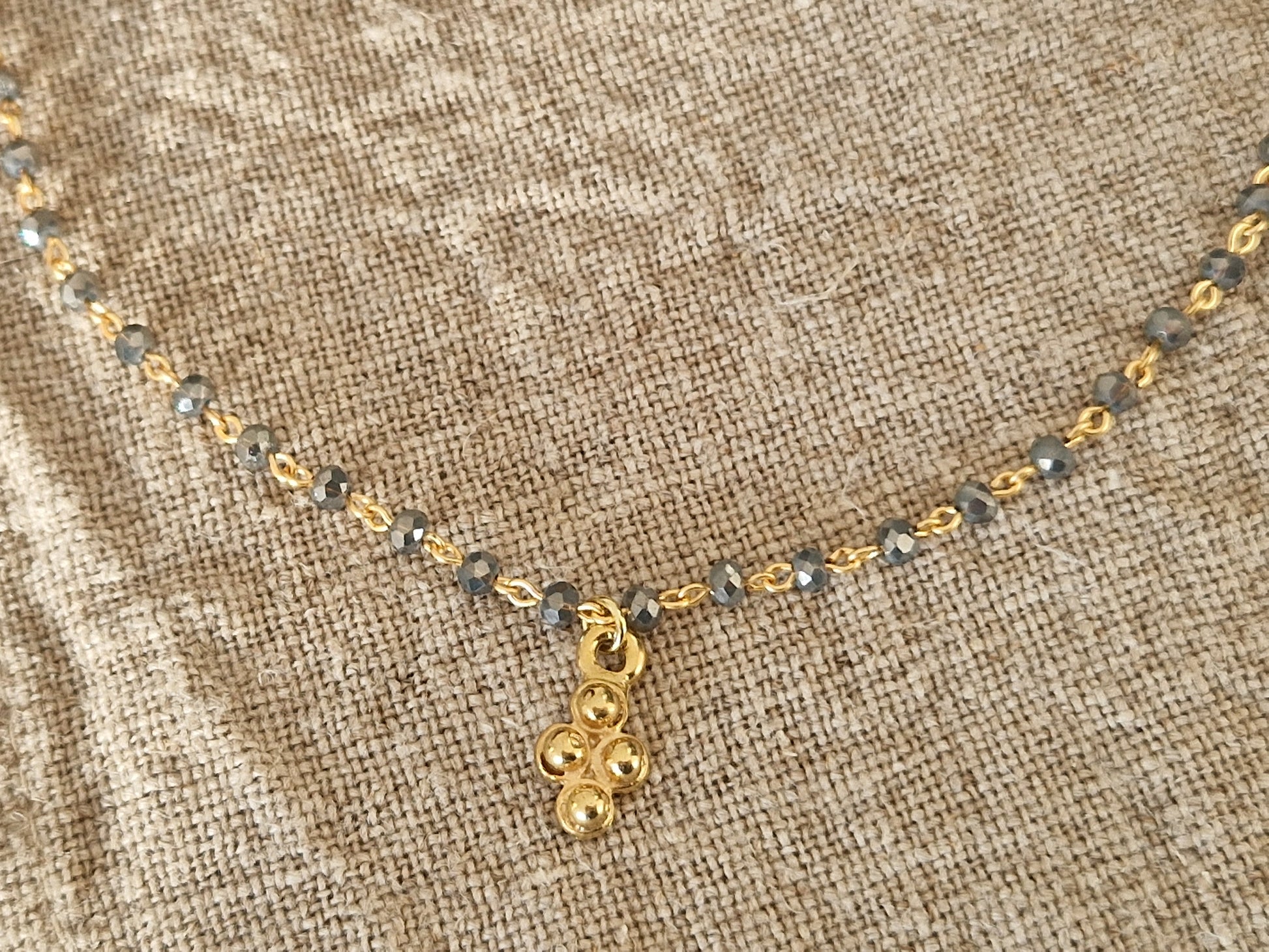 Un collier fin et stylé, composé d'une chaîne perlée grise et d'un pendentif croix dorée avec petites boules. Une pièce à la fois moderne et intemporelle.