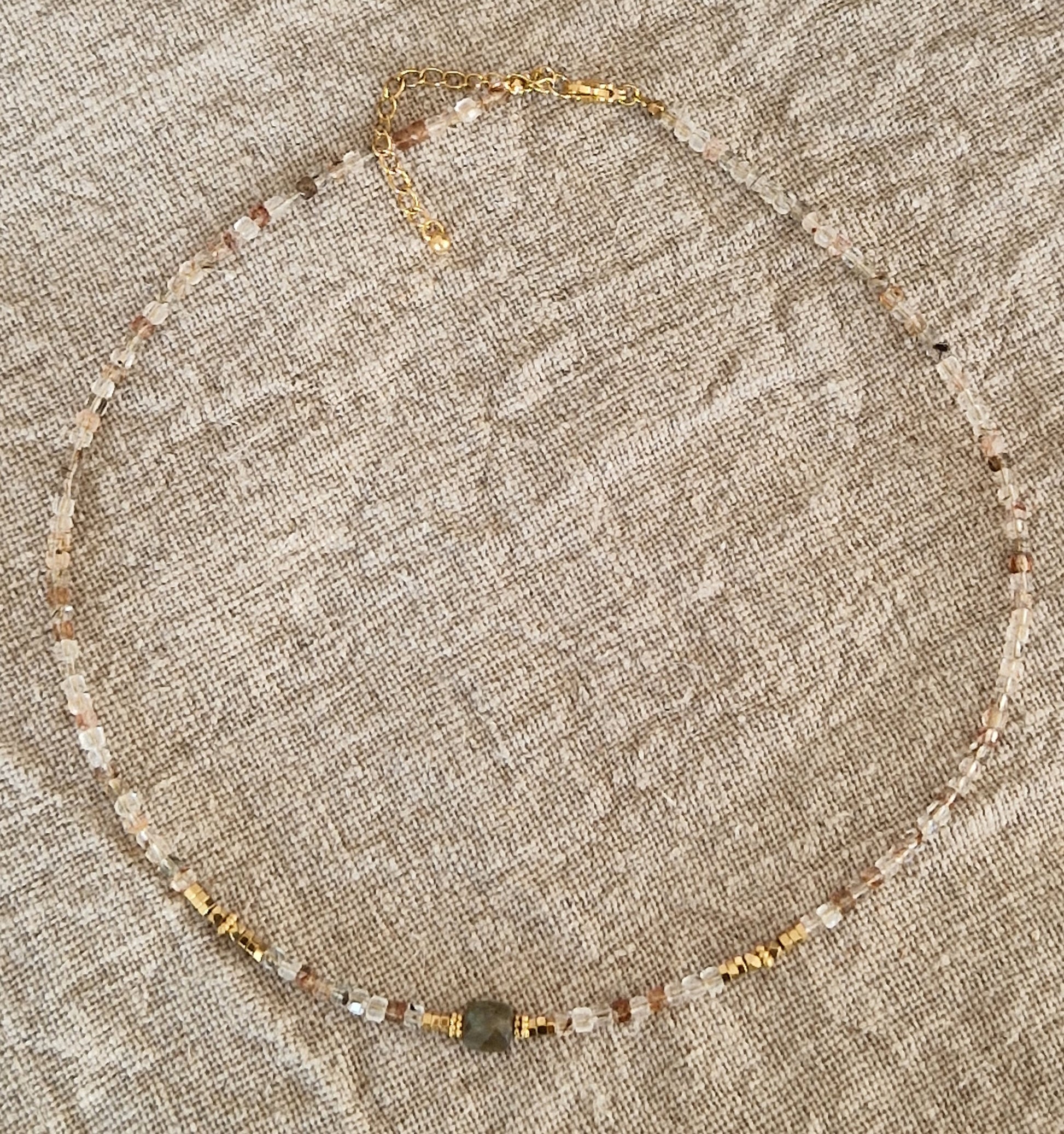Un collier fin et lumineux, composé de petites perles cubiques facettées en quartz rutile, aux éclats délicatement dorés. Une perle carrée en labradorite aux reflets changeants attire subtilement la lumière au centre. Quelques touches de doré viennent réchauffer l'ensemble, pour un bijou à l'élégance minérale et moderne.