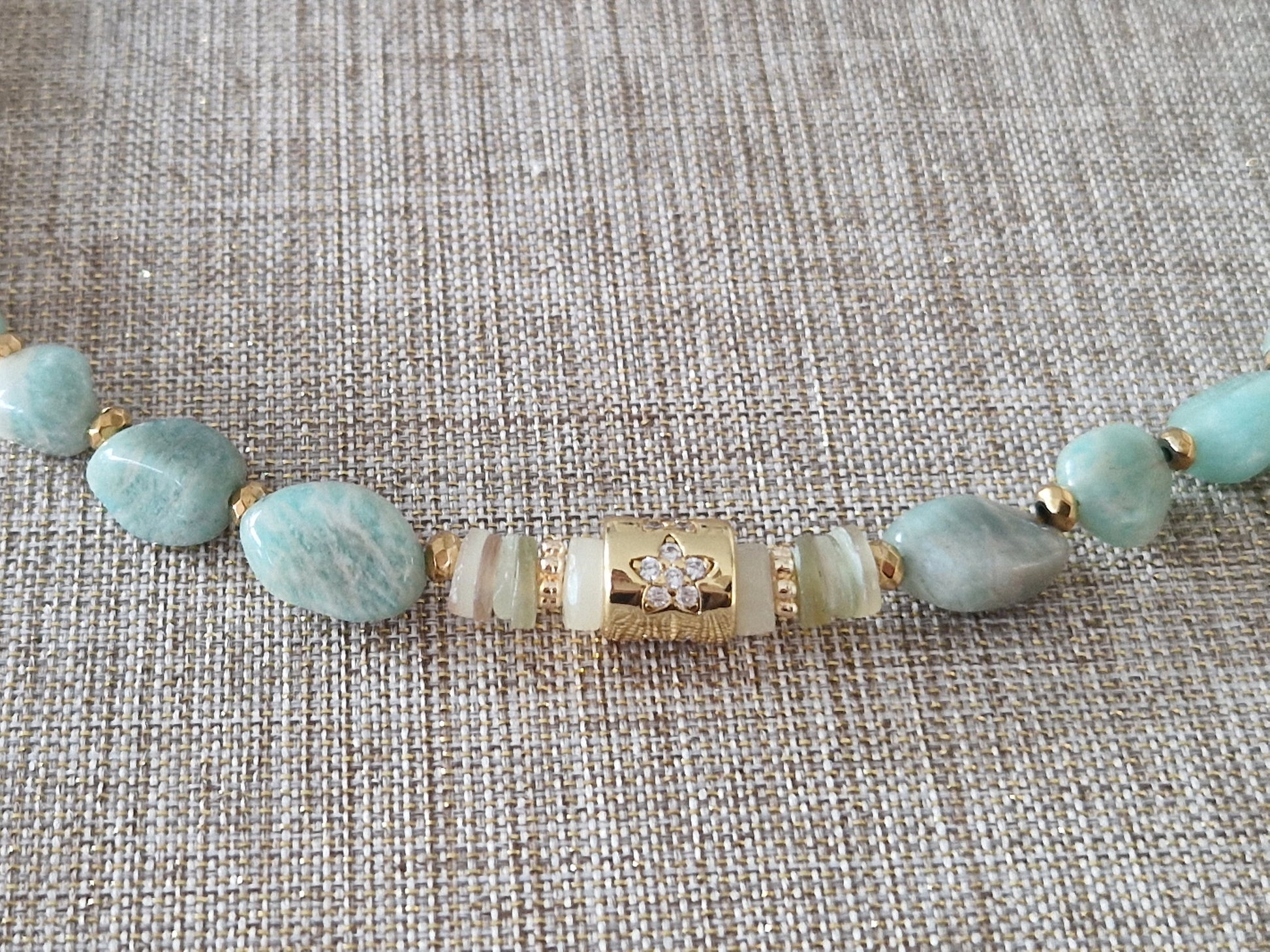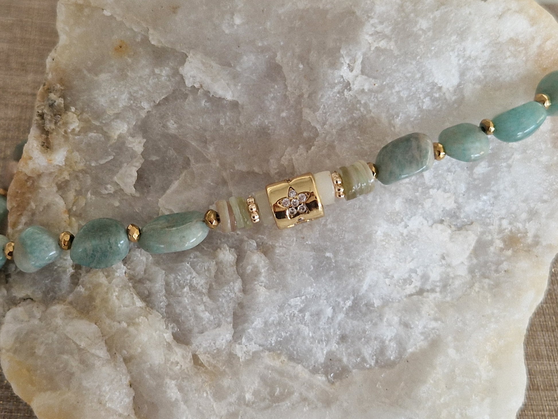 Un collier poétique et lumineux, composé de perles irrégulières en amazonite aux nuances douces. Au centre, une perle dorée ornée d'étoiles incrustées de zircons illumine le tout.