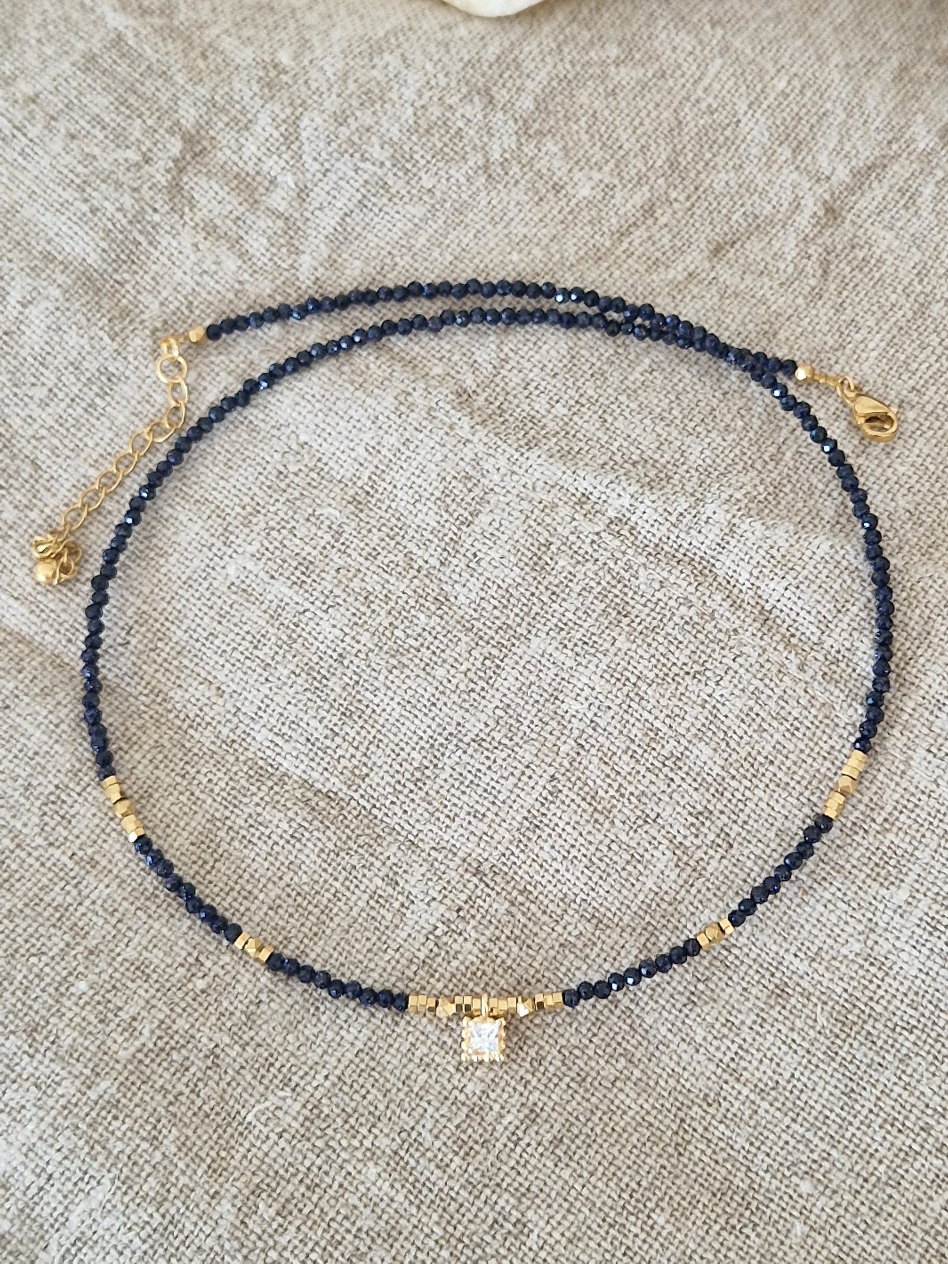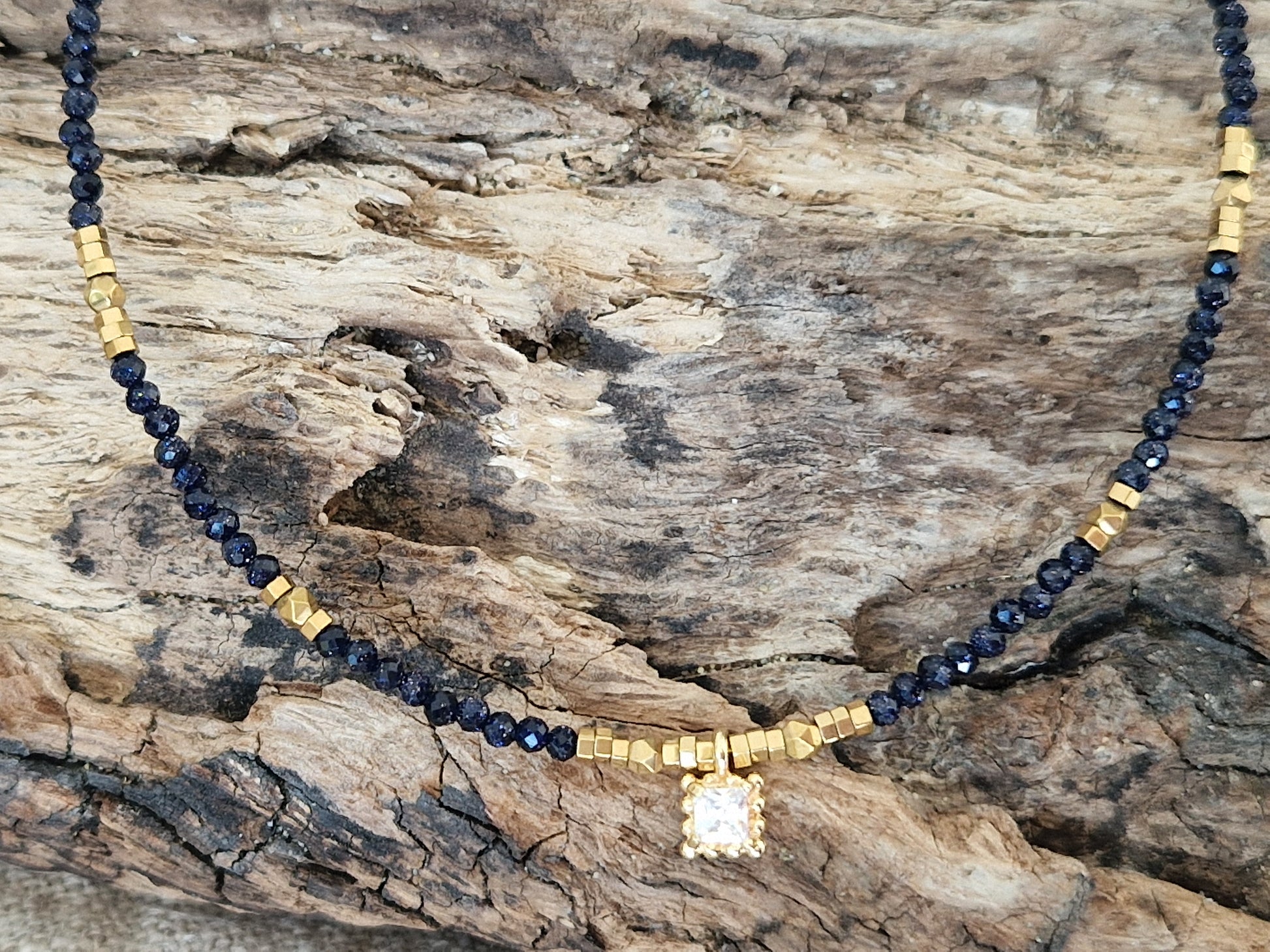 Un collier élégant et mystérieux, composé de fines perles facettées en pierre de sable bleu évoquant un ciel nocturne parsemé d'étoiles, et de touches d'hématite dorée.