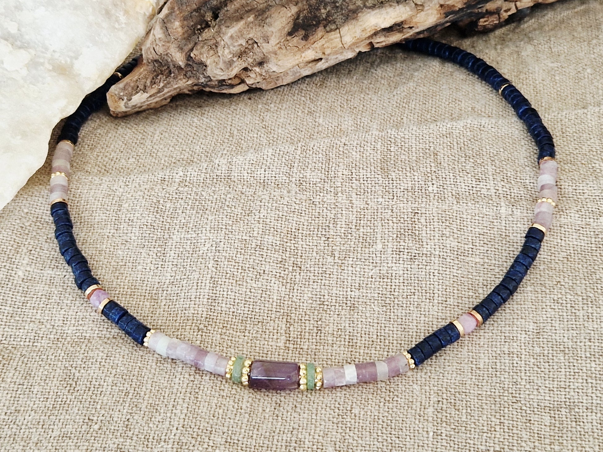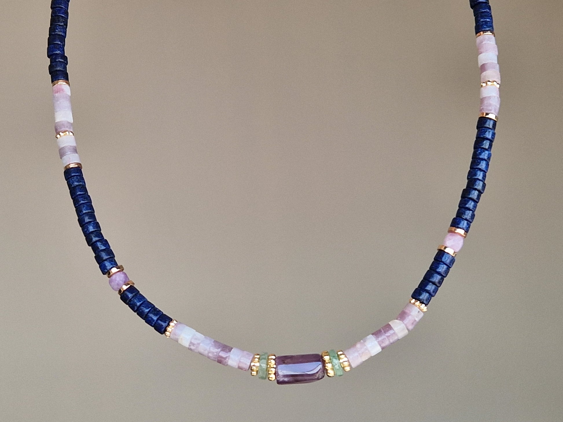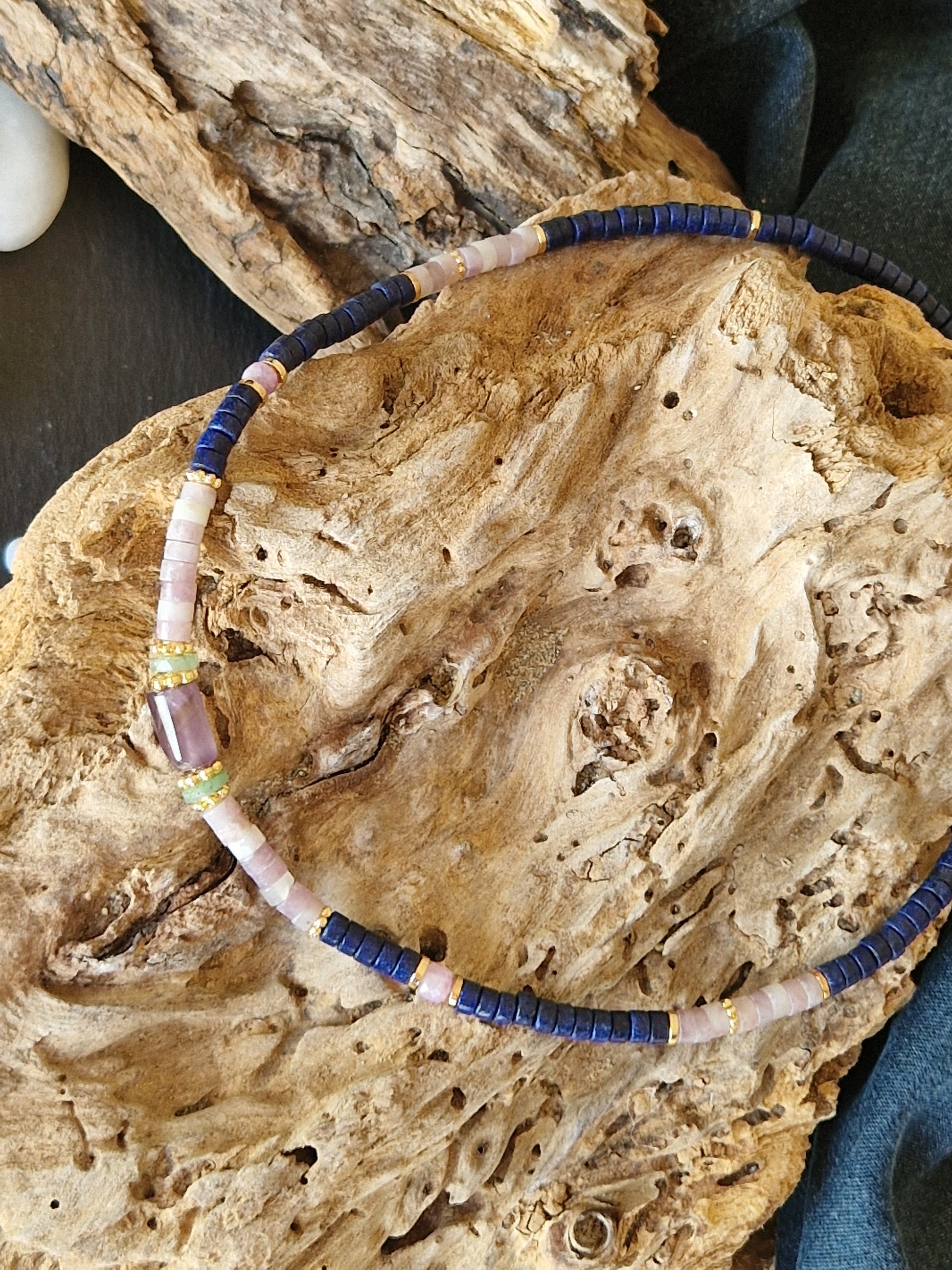 Un bijou aux couleurs subtiles et contrastées, inspiré de la nature et du ciel. Ce collier se compose de perles heishi en lapis lazuli profond, mêlées à la douceur lilas de la kunzite et relevées par quelques touches fraîches d'aventurine verte. Une harmonie minérale qui allie intuition, calme et énergie naturelle.