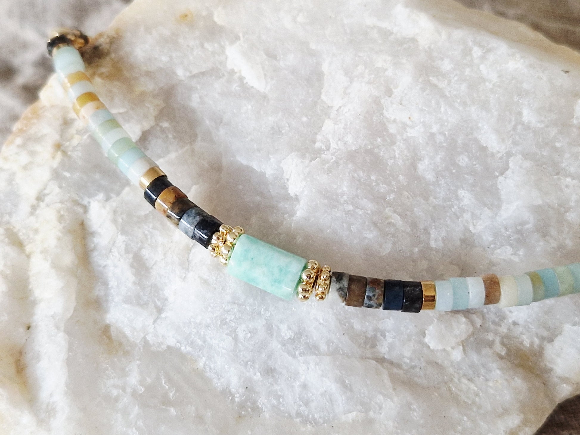 Un bijou inspiré par l'harmonie des éléments. Ce collier marie la douceur bleutée de l'amazonite et les nuances chaudes et marbrées de l'agate crazy lace, dans un équilibre entre ciel et terre. Une perle en amazonite au centre structure le collier avec sobriété.