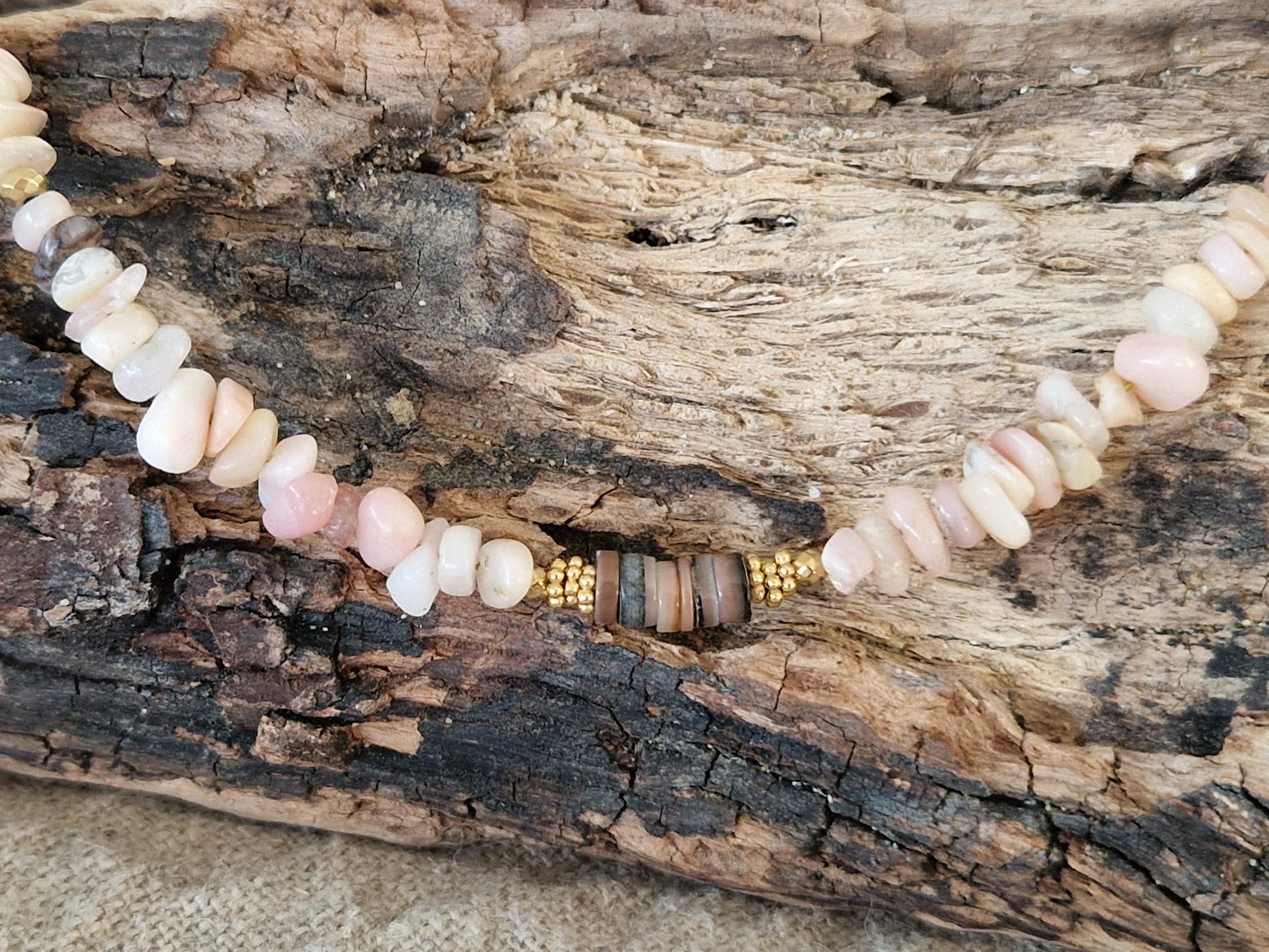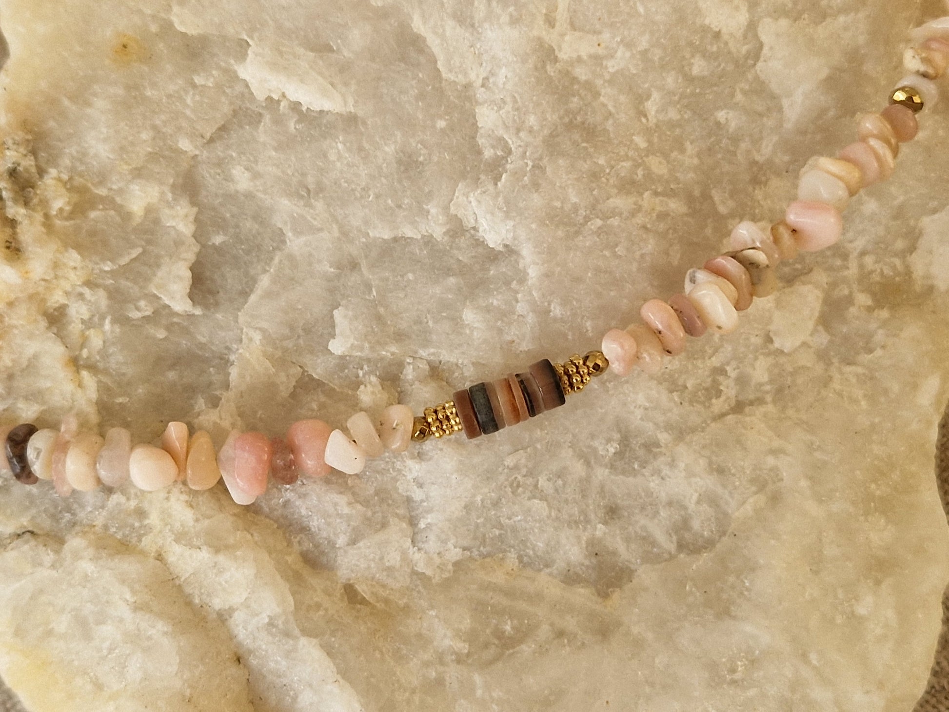 Un collier au charme délicat et naturel, composé de pépites d'opale rose aux tons tendres et nuancés, rehaussées en son centre par des perles en coquillage brun-beige. Une pièce lumineuse, féminine et pleine de douceur.