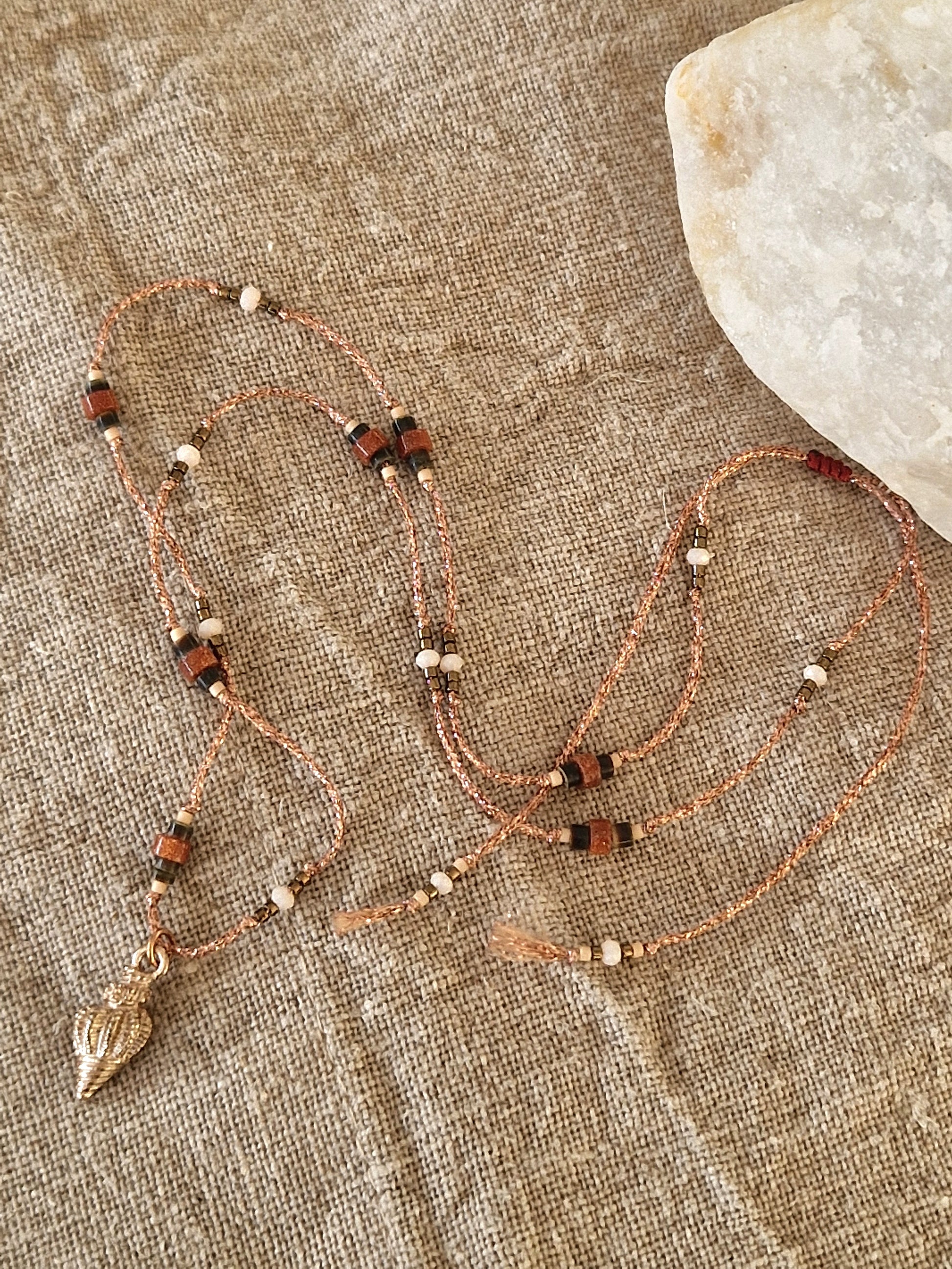 Un bijou lumineux et éclectique, inspiré des trésors échoués au bord des vagues. Ce collier est monté sur un lien cuivré brillant, orné de perles variées. Le tout sublimé par un pendentif en forme de coquillage doré cuivré. Une pièce originale à la fois bohème et moderne.