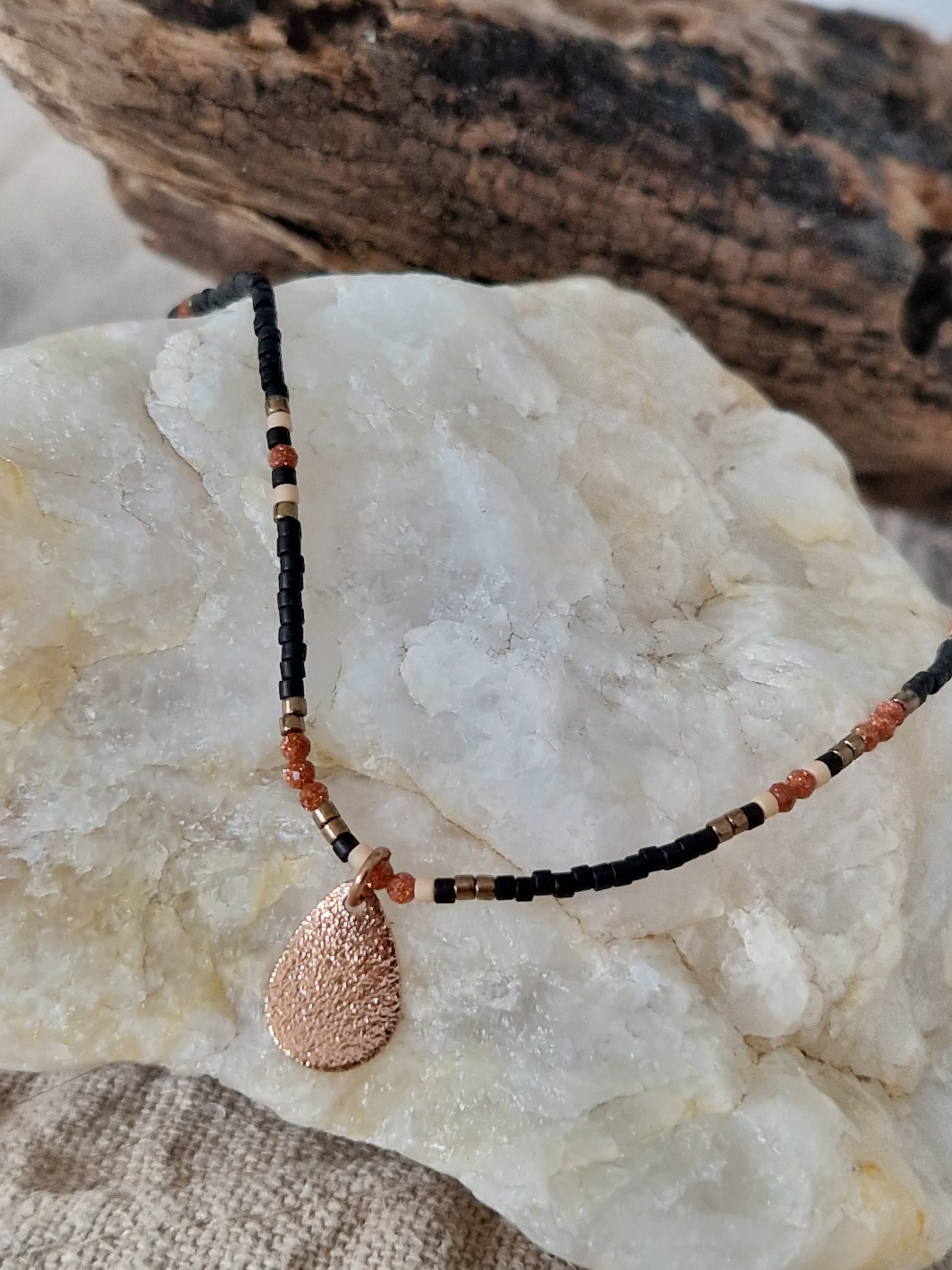 Un collier élégant et minimaliste qui marie la profondeur du noir à la chaleur du cuivré. Les perles fines Miyuki, en nuances noir, bronze et nude, et les perles en pierre de sable doré s'accordent autour d'un pendentif texturé cuivré, pour un bijou moderne, raffiné et lumineux.