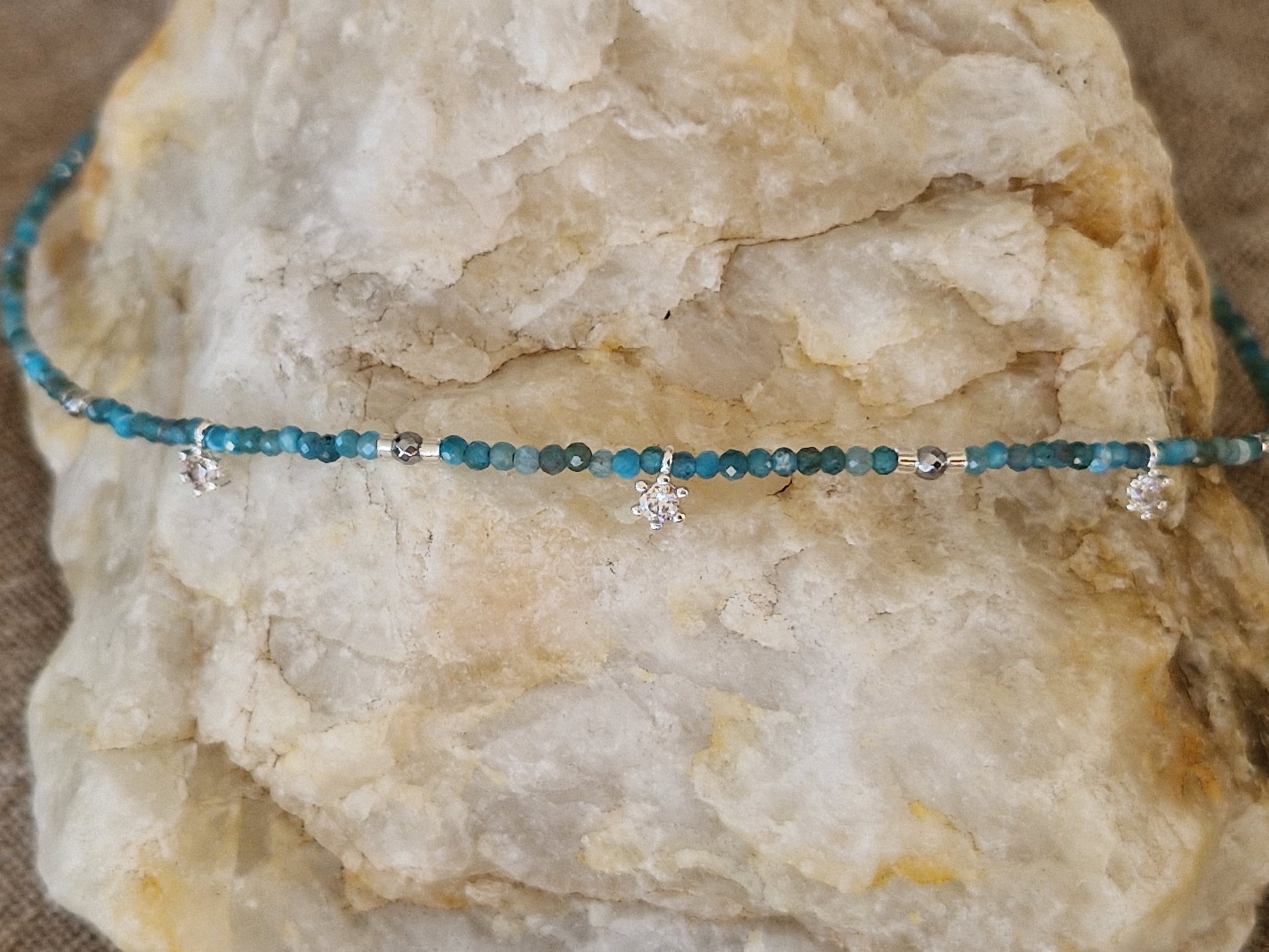 Un collier délicat et scintillant, composé de micro perles d'apatite aux reflets bleu glacier, sublimées par trois mini pendentifs argentés et strassés. Léger, raffiné, lumineux.